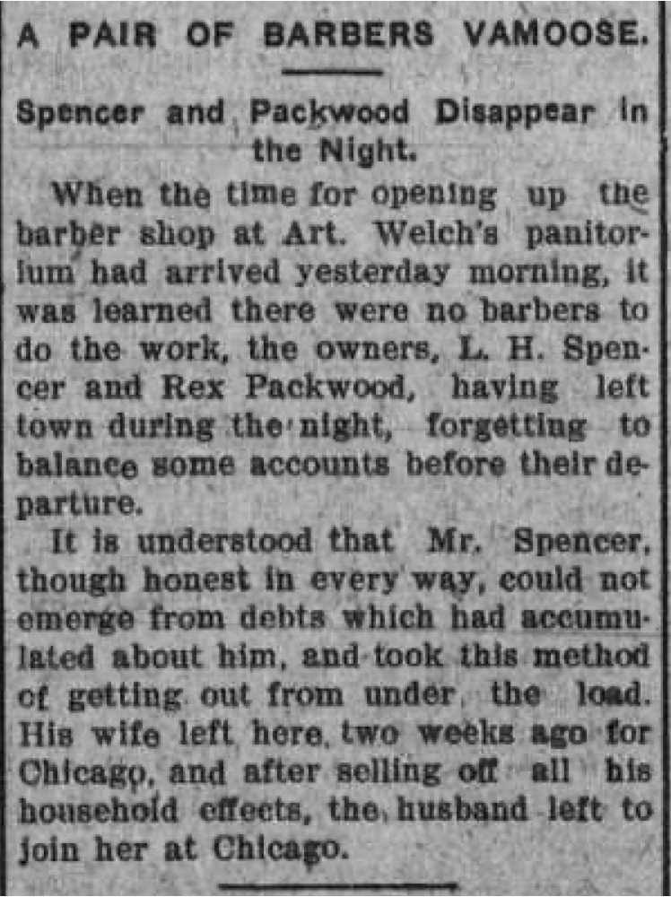 LaMorte Spencer was a raised Master Barber, accomplished and connected. Whatever shook him also shook Rex. Threats from authorities? The Black Hand? Socialists? Puritans? Other Barbers? The sun went down one night and LaMorte ran away from the barber trade and Muscatine and settled in Chicago somewhat placidly.