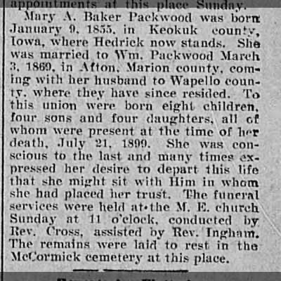 William Samuel Packwood II married Mary Alice Baker in 1869. He had come to Iowa as a child, brought by his father and uncles shortly after Iowa had been appropriated for settlement. They had lived in Indiana beforehand, in both cases the family expanded into newly acquired territories essentially stolen from the displaced indigenous people.