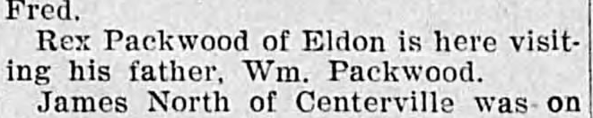 Two months later in March, Rex visits with his father back in Ottuwma. This might be a coded statement, as a “visit” in 1903 is more unwieldy than today. Mittie and three month old Harold are not mentioned and seem to have been left at home. This is the last we hear from Rex the farmer.