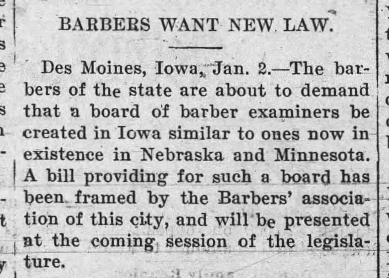 To be a barber in Iowa in 1900 was to scrap with socialists, capitalists and puritans. The socialists wanted to regulate your income. The capitalists wanted to embezzle your income. The puritans wanted to limit your work hours and availability vice trades. Your allies were the prostitutes, opium peddlers, cigar and paper salesmen. The prostitutes were under attack by the same puritans and often worked similar late hours to the barber shop. The opium peddlers the same and often on the same block. The cigar and paper salesmen were somehow caught up in the same anti-vice dragnet for the guilt of selling on the Sabbath.