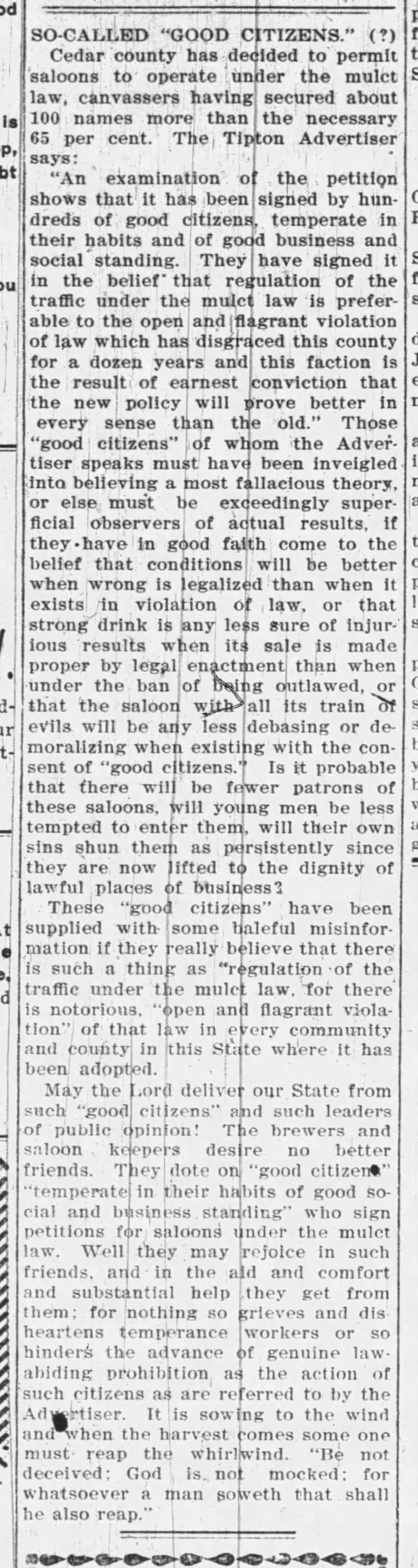 The Mulct law in Iowa made it so that saloons were default illegal unless 65% of a county or town were to vote in favor of having them. The above posting reveals a terrible oppostion to any relaxation of the anti-saloon laws. To police a saloon was to police the bodies that inhabit it, the vices or unsavory practices they bring with them.