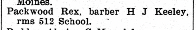 It’s 1904 and suddenly Rex is a barber in Des Moines, Iowa. The change is swift and permanent. He will list himself as a barber for the rest of his life.