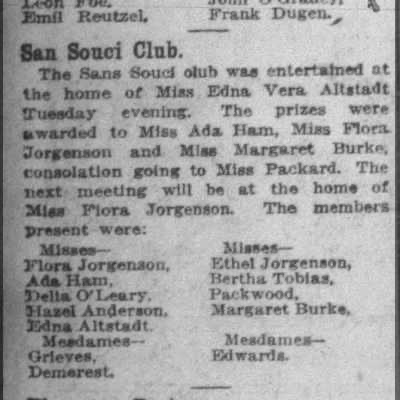 The last published meeting of the Golden Rod Club with Mittie is in November of 1912. Some time after that she appears in the Saunier club and finally in the San Souci Club in late 1913. Saunier means one who makes salt; the arcane meaning of this is lost. San Souci means “care free” and was not an uncommon phrase, also the name of a fine palace in France and once against strongly associated with Freemasonry.