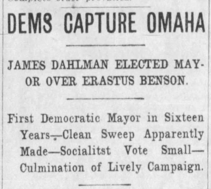 Pickhandle goes to work to maintain his racket through the changeover and sets his sights on charming newcomer Jim Dahlman. Classic election rigging is outlined in the by the Omaha Daily Bee below:
