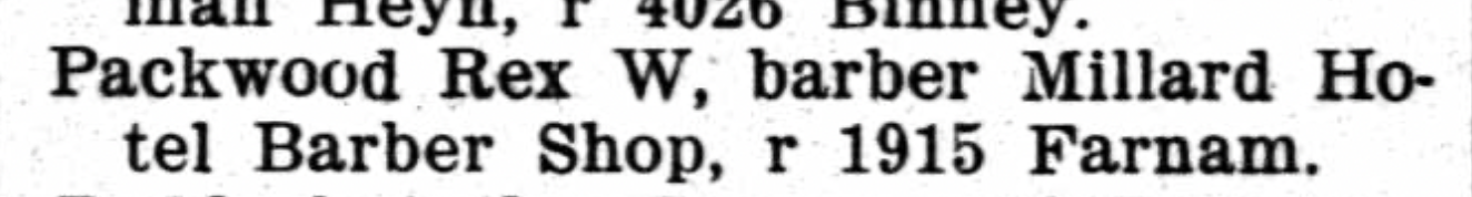 In the 1907 Omaha city directory Rex appears as a barber at the Millard Hotel at 13th and Douglas, just one block away from the Budweiser Saloon and headquarters of Dennison. This would be a high traffic area with a lot of opportunity for working the razor along with any side hustles that had developed. There would be a constant rush of new and old faces as people filtered into and out of the wilder west. A whirlpool of grift.