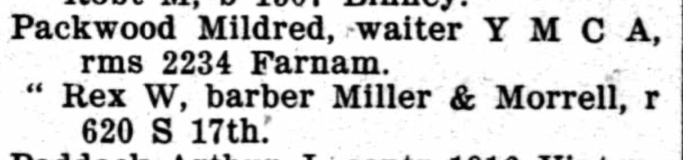 It’s 1909 and Mittie and Rex still report seperate addresses. Rex has moved from the Rome Hotel to the also elite Miller and Morrell at 214 S. 15th St. It’s a respectable shop and still deep within Dennison’s territory, only one block west of his headquarters at the Budweiser – perhaps the closest barbershop thereto.