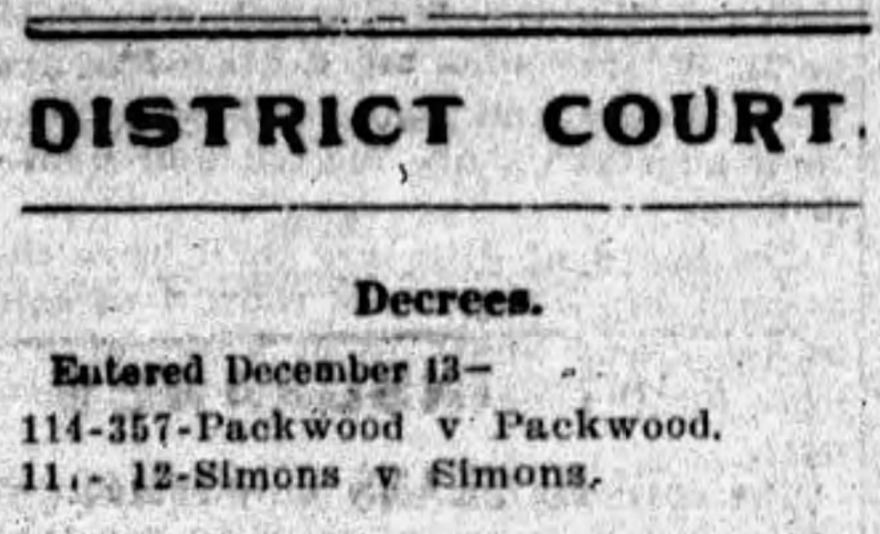 Later in 1911 this posting appears in the papers in Omaha; it announces a coming court date for Packwood v. Packwood, case no. 114-357. The divorce of Mittie from Rex. In 1911 one could only divorce their husband if they met one of three qualifications: abandonment, adultery, or extreme cruelty. What sin in particular Rex was found guilty of is lost to time. In December of that year the case was ruled on. Throughout this whole time Mittie is routinely in the Golden Rod Card club postings and Rex is no where to be found. He might not have known he was divorced, or he might not have cared.