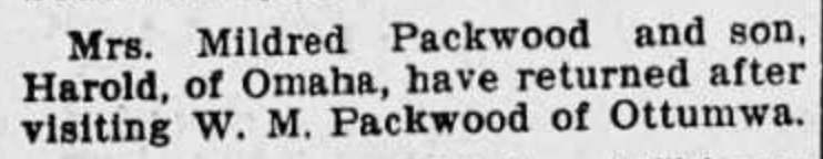 Mittie quits Omaha finally and she and Harold return to Ottumwa. In 1914 she visits W. M. Packwood, who we assume is a typo’d William Packwood – Rex’s father. Dorothy is not mentioned. What did they speak about?