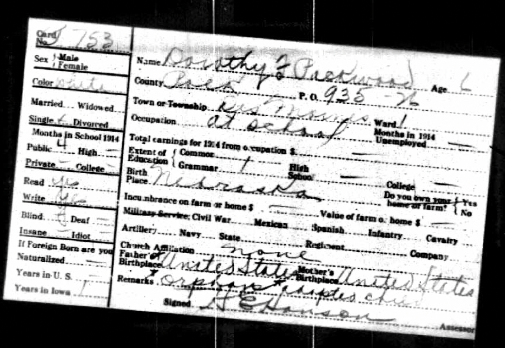 In 1915 Dorothy reappears, in Des Moines, alone. Marked as an orphan at the age of 6 we can only guess how she became separated from both Mittie and Rex. Des Moines is on the western side of the direct trip between Omaha and Cleveland. Was she abandoned? Did she run away? What kind of horrors did a six year old see on her way between Omaha and Des Moines?