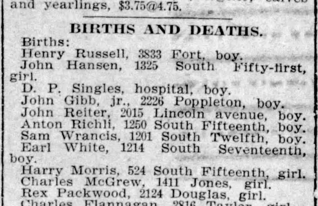 We can thread a guessed conception date of October 1907 with the directory recording their addresses around the same time. The records suggest that shortly after arriving in Omaha, their marriage became complicated and estranged.